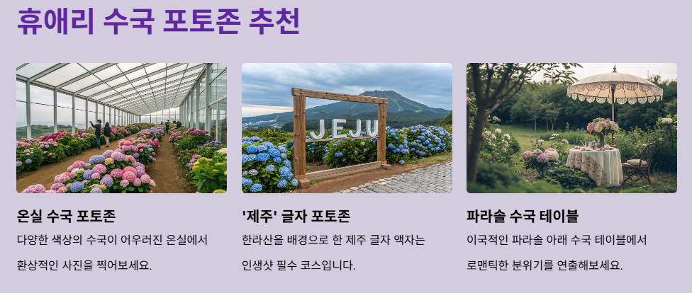 2025년 휴애리 수국축제는 6월 초부터 7월 중순까지 진행될 예정입니다.